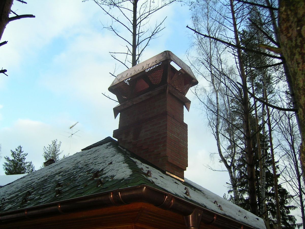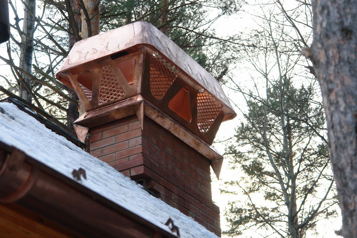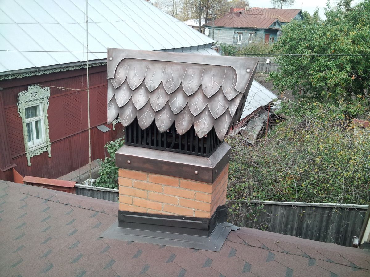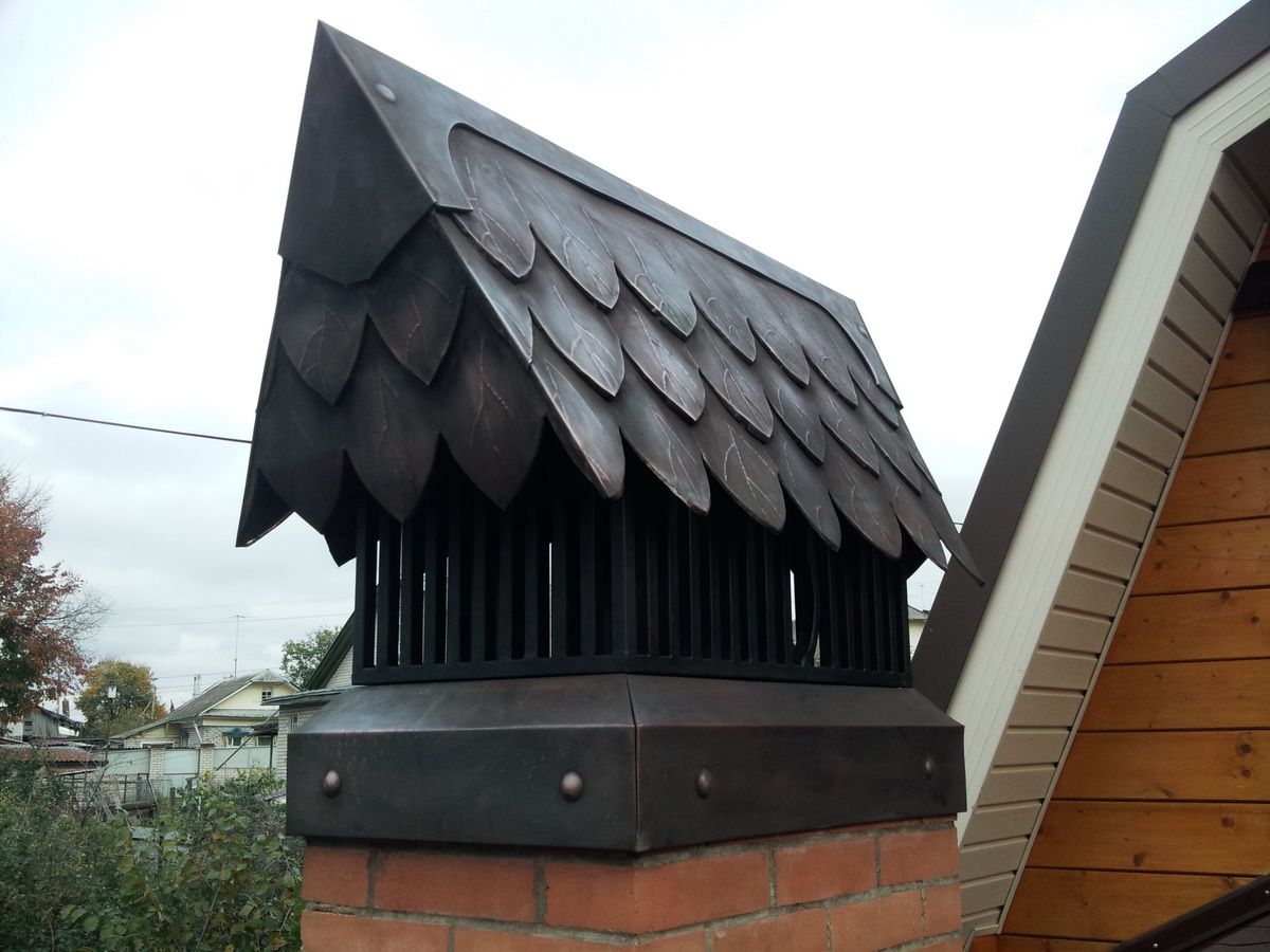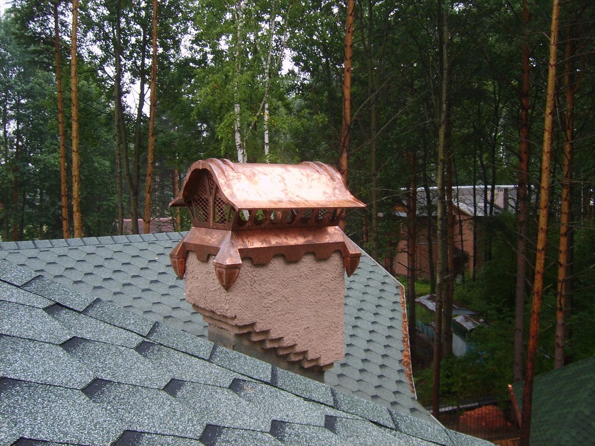 Медь. Дымники из меди самые практичные и служат крайне долго, так как с течением времени поверхность материала медленно покрывается патиной, словно, дозреая и улучшая защитные свойства.