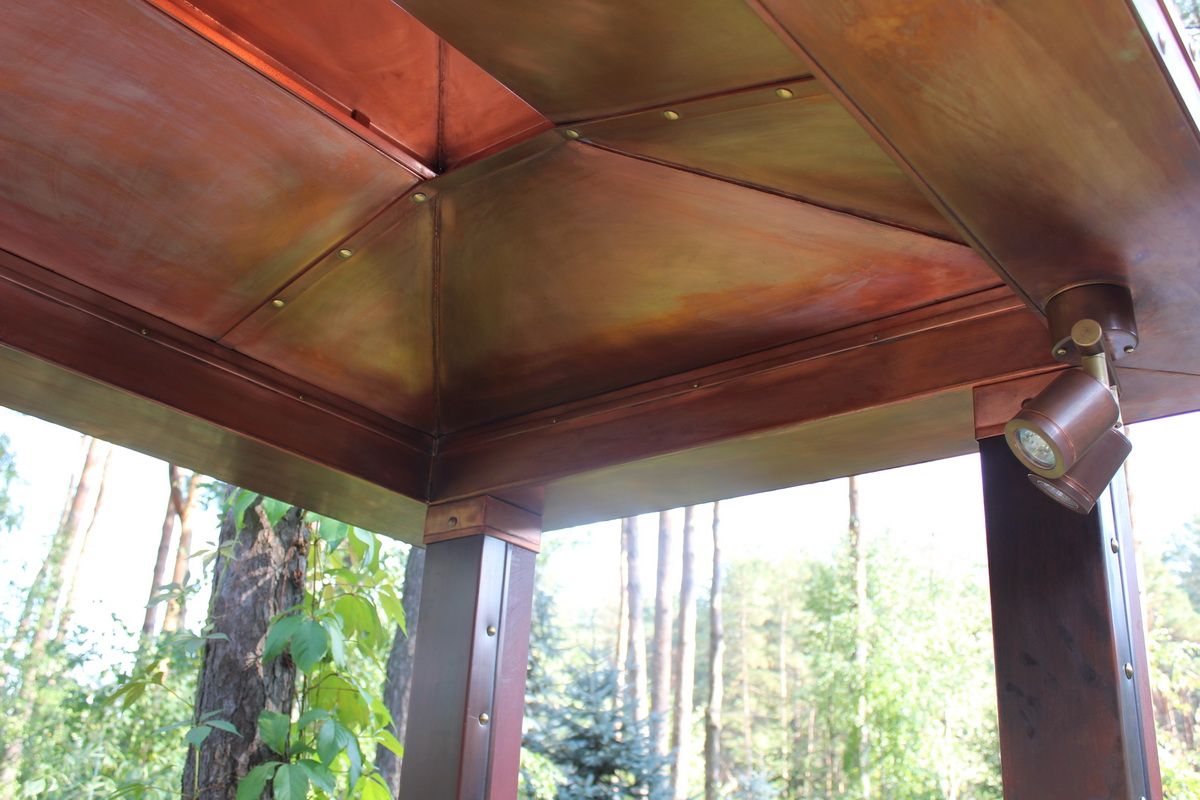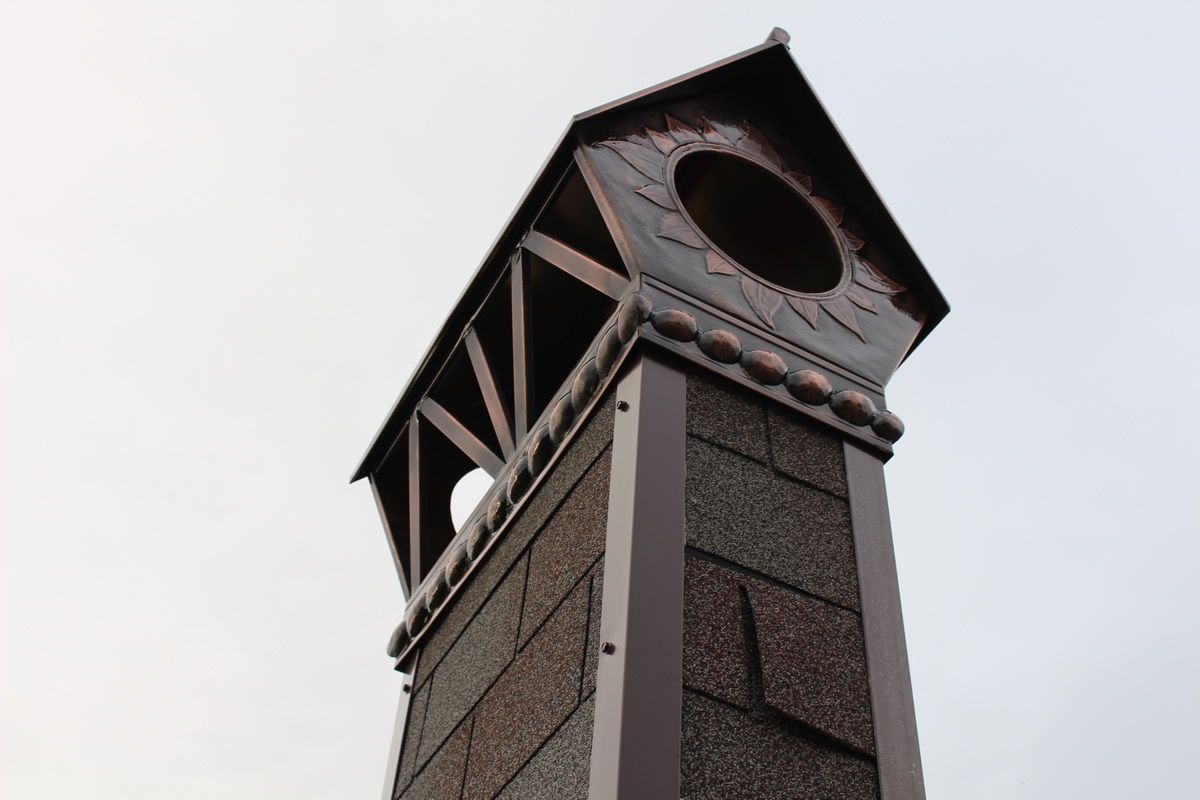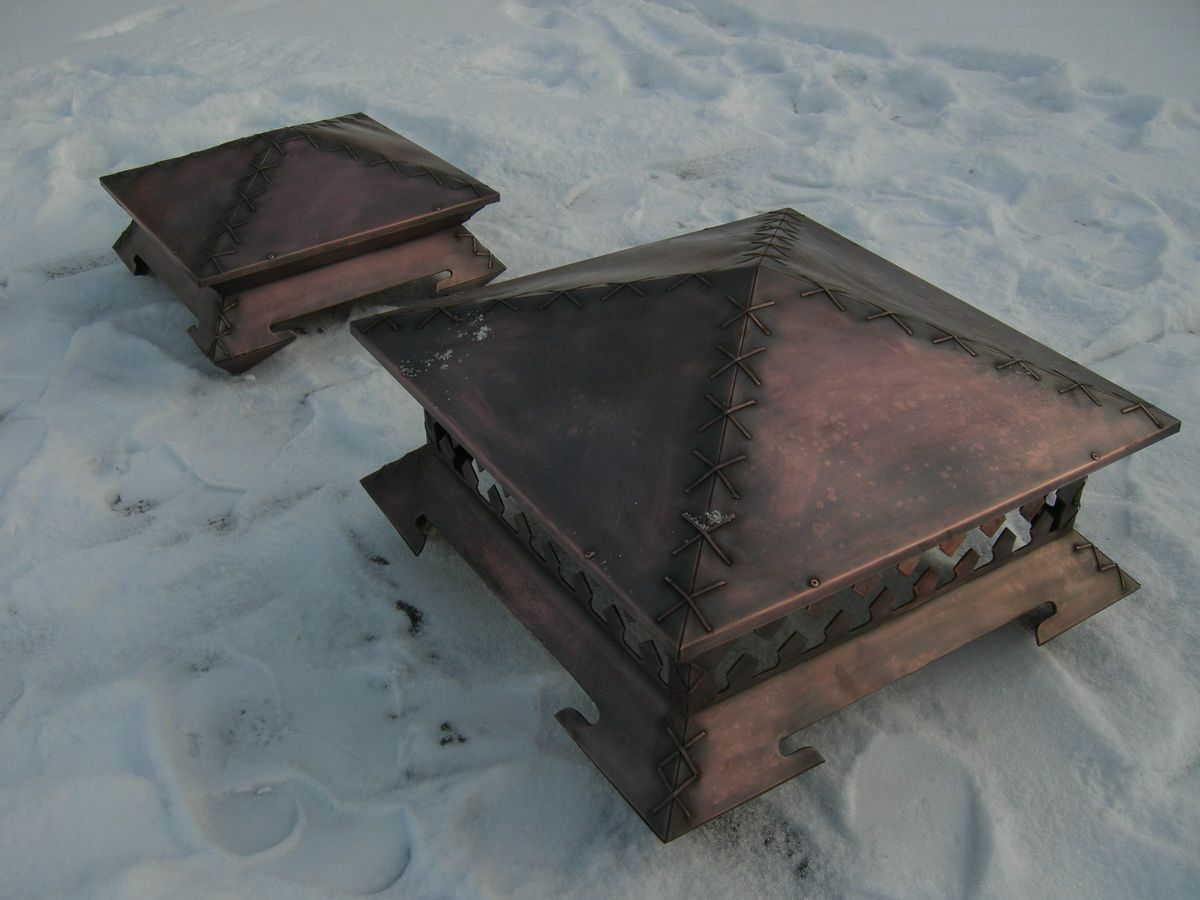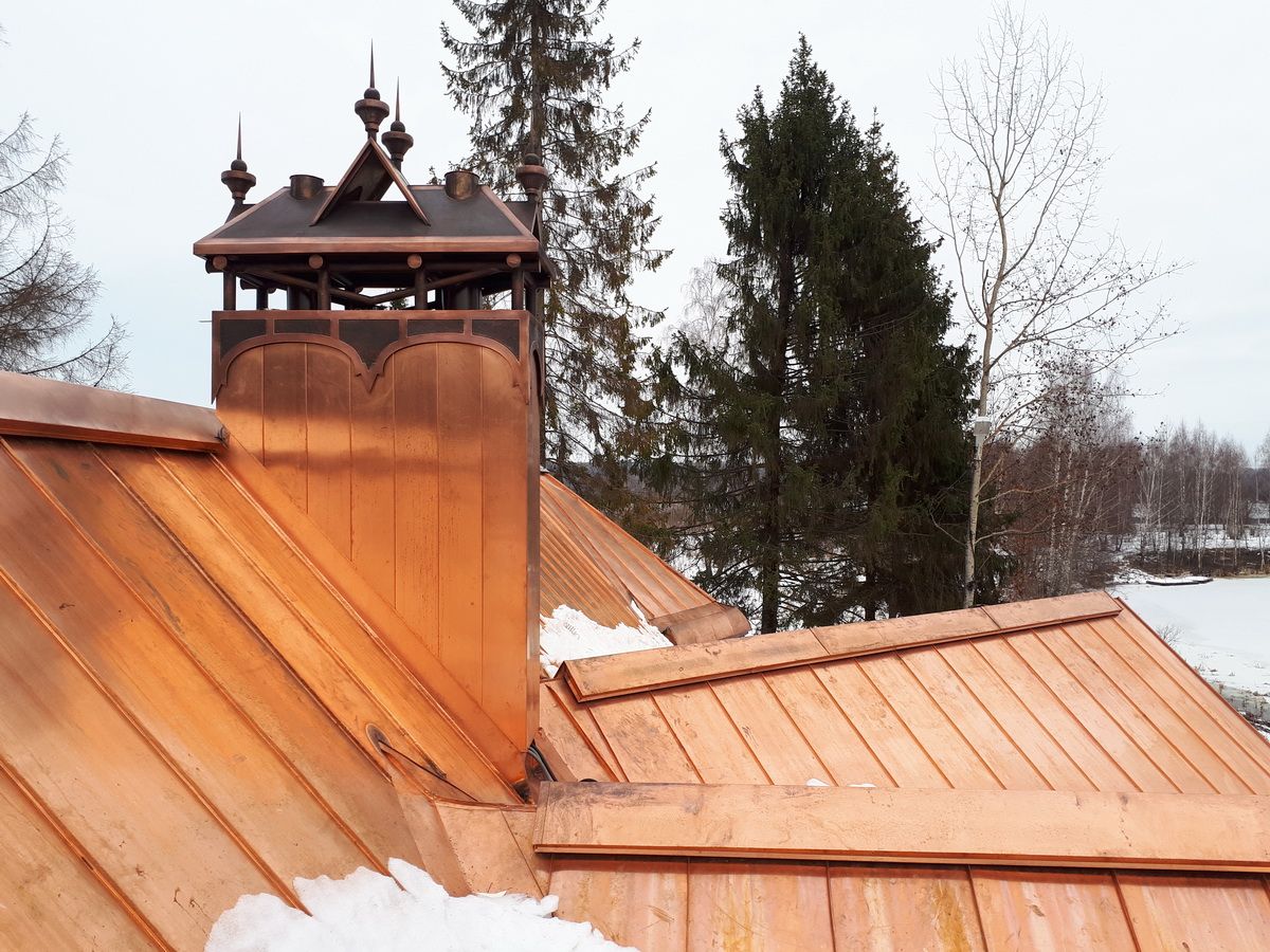 Медь. Дымники из меди самые практичные и служат крайне долго, так как с течением времени поверхность материала медленно покрывается патиной, словно, дозреая и улучшая защитные свойства.