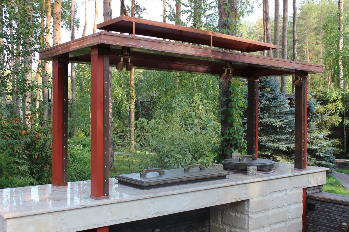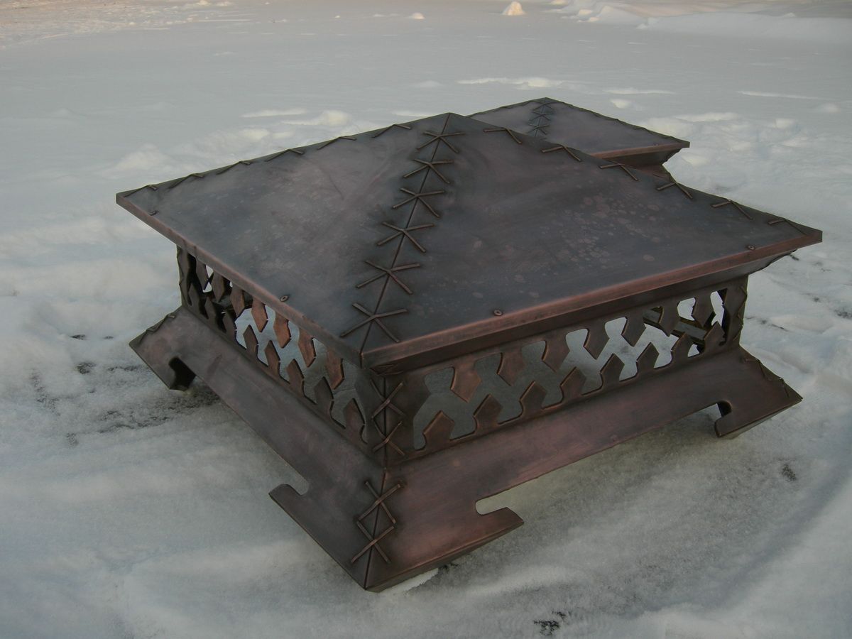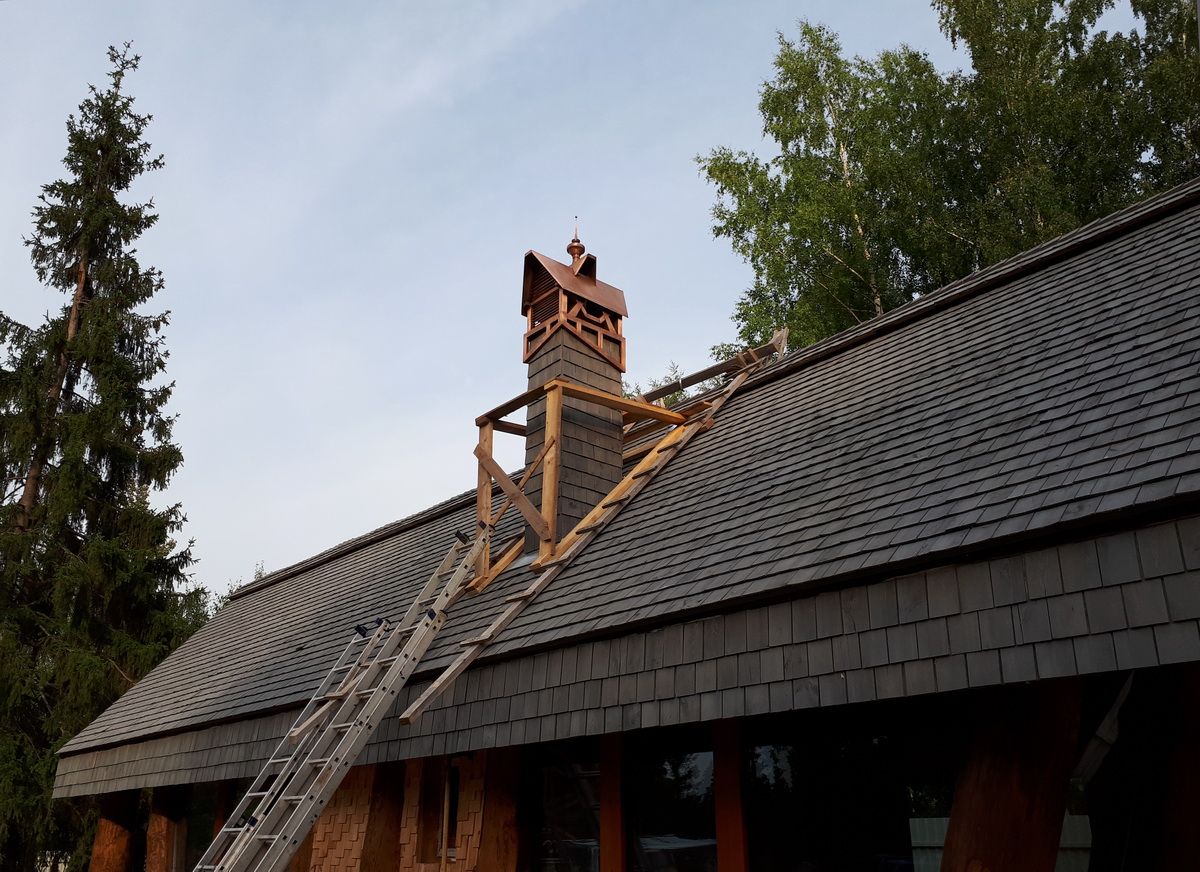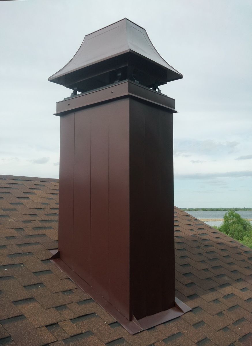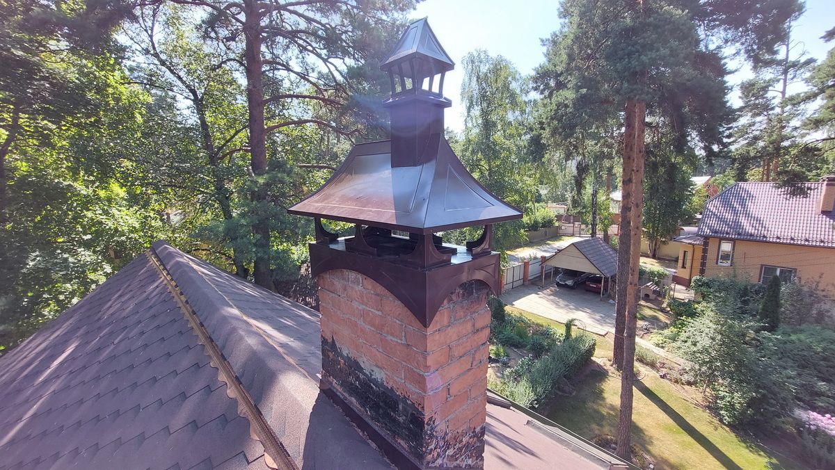 Медь. Дымники из меди самые практичные и служат крайне долго, так как с течением времени поверхность материала медленно покрывается патиной, словно, дозреая и улучшая защитные свойства.