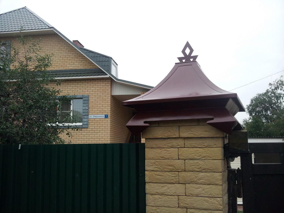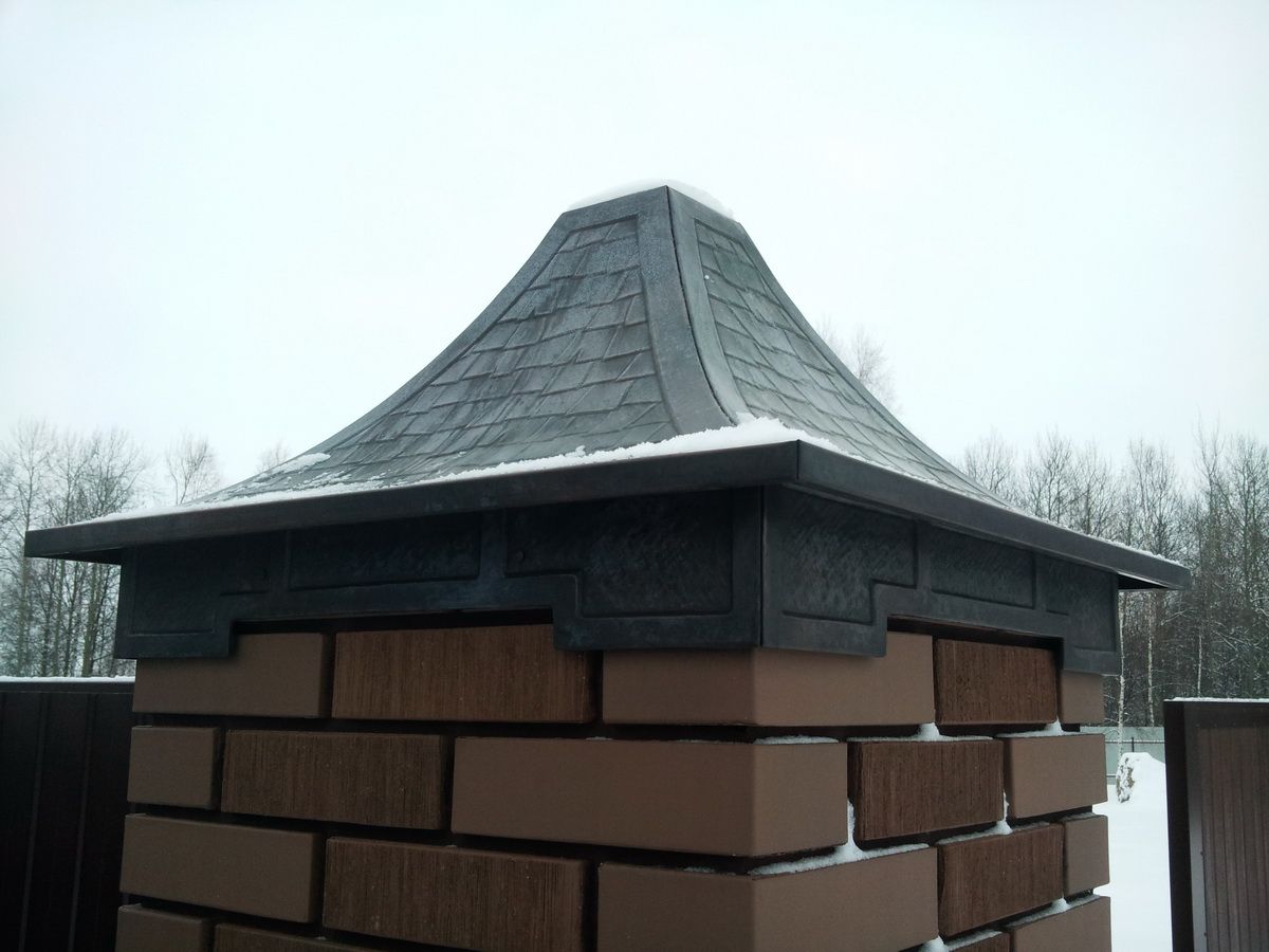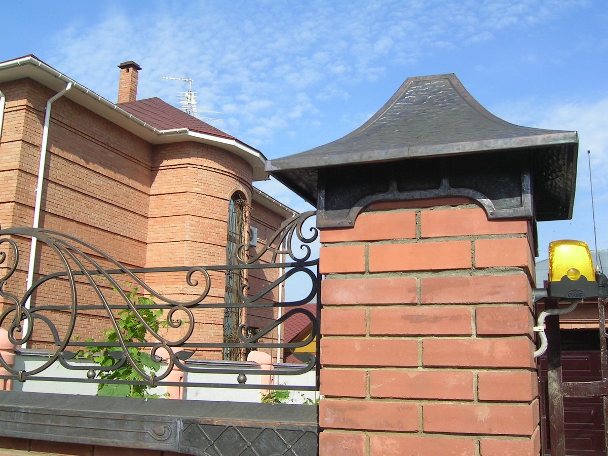 Столбы. Известно, что данные товарищи имеют фундаментную часть (там в недрах), состоят из кладочного тела и гордятся своим верхом. Здесь, есть смысл заглянуть в обзорную статью о дымниках, флюгарках, вытяжных колпаках: смотрите выше предыдущую страницу. Та же история, что и в статье про дымники и флюгарки: Защита верхнего пояса кладки от рассыпания под воздействием суровой в наших широтах внешней среды. Столб без навершия, это как военный без погон, как троллейбус без дуги, как СССР без Пятилетки, а вот увенчанный своим навершием - это уже Ого-го! Да что рассуждать, смотрите ниже на фотоснимках.